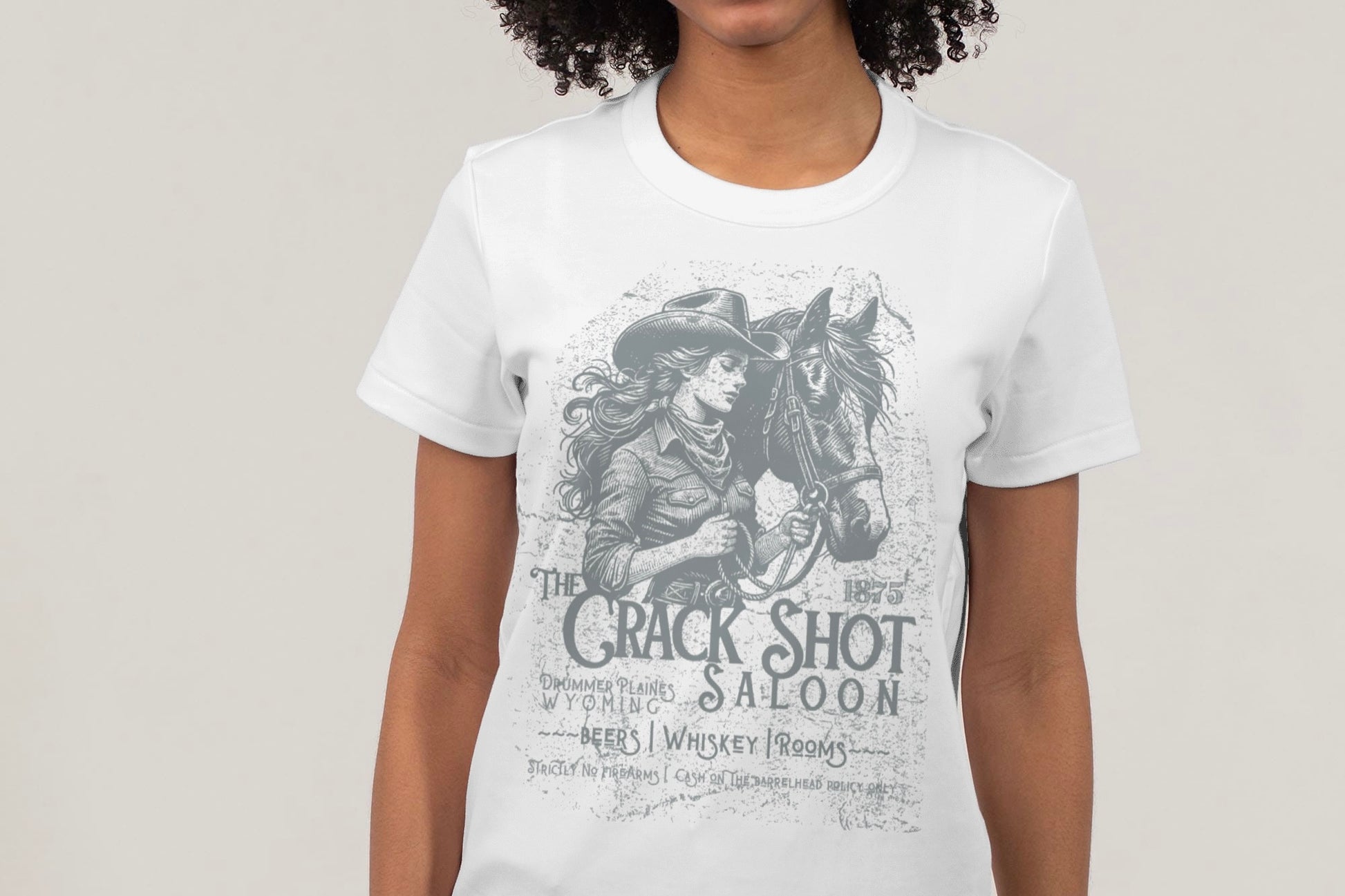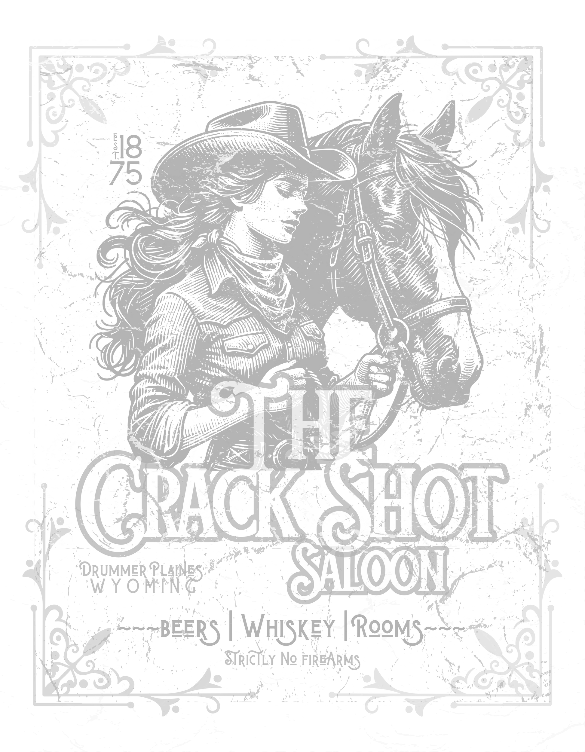 Step into the dust and legend of the old frontier with The Crack Shot Saloon tee — a vintage-inspired graphic tee that captures the independence, and wild charm of the Old American West. Featuring a detailed illustration of a lone cowgirl and her horse, framed by ornate scrollwork and distressed textures, this design holds a weathered finish bringing a lived-in feel Perfect for those who live by their own code — independent, fearless, and unapologetically free!